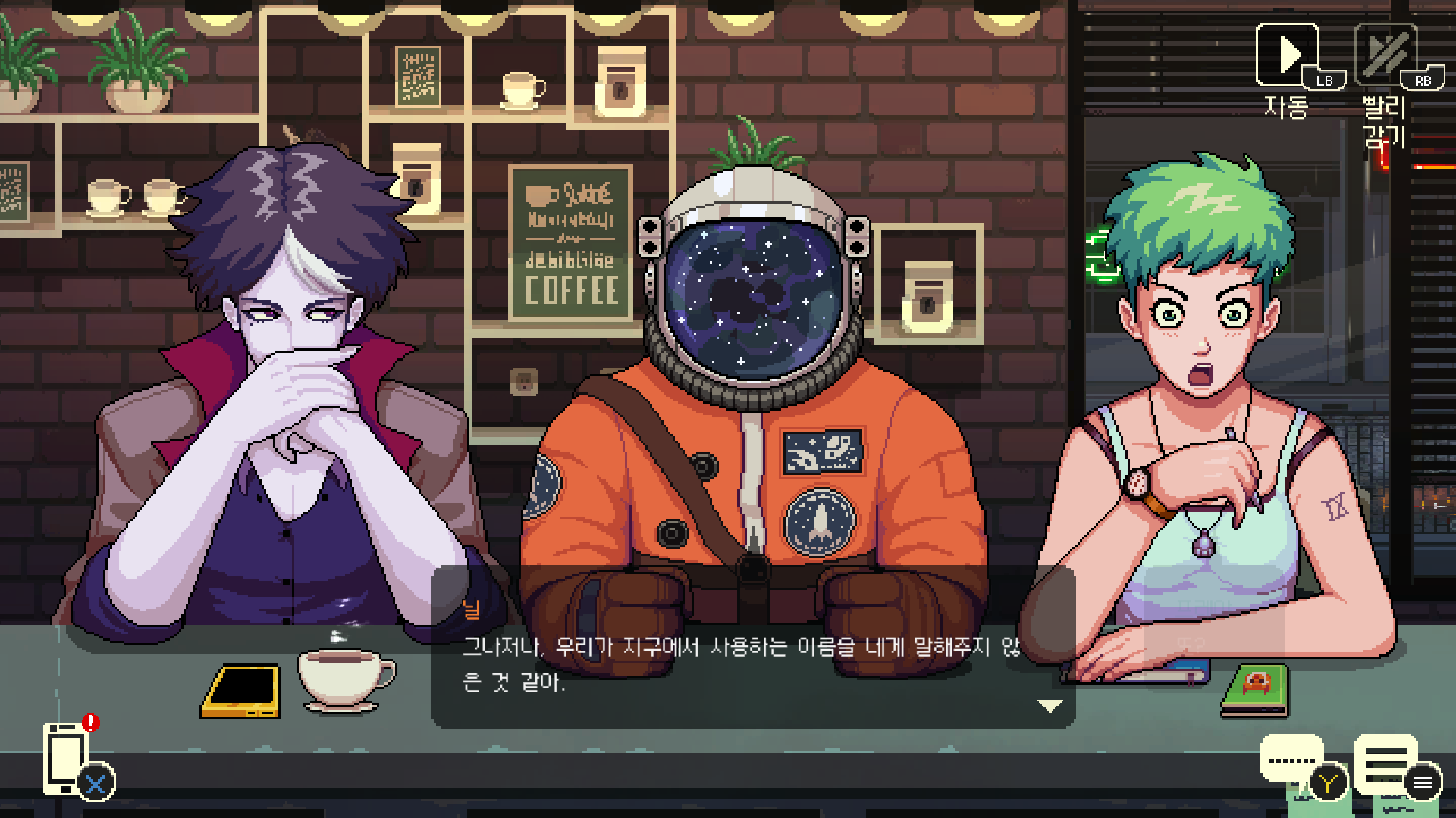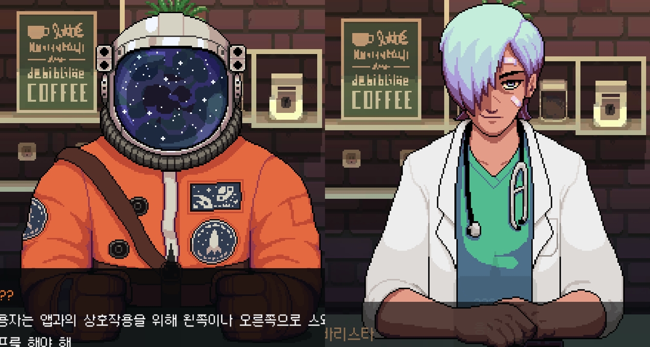 카페 사장 주인공이 손님들에게 커피를 제공하며 여러가지 이야기를 듣는 도트갬성 비주얼 노벨 인디게임.