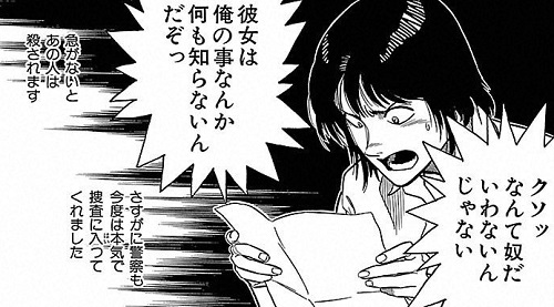 우연히 산길을 운전하다가 혼자 있는 여성을 발견한 주인공. 비오는 날이라 산속에 있는 그녀에게 우산이라도 건네주려고 하는데, 이때 그녀(마나)의 남친(다부치)이 등장. 다부치는 마나가 주인공과 사귀고 양다리를 하는거라고 착각하고 주인공을 구타. 팔을 골절시켜버림. 이에 주인공은 그를 뿌리치고 겨우 도주한다. 골절로 입원하게 된 그에게 다부치는 마나가 네가 누군지 안불고 있다면서 그녀의 머리카락, 이를 보내온다. 즉 고문을 하고 있었던 것. 결국 주인공은 마나를 고문하고 있는 곳으로 찾아가고, 다부치는 살인미수로 경찰에 체포. 이후 주인공과 마나는 사귀게 되는데... 아직도 그들을 쫓는 다부치.