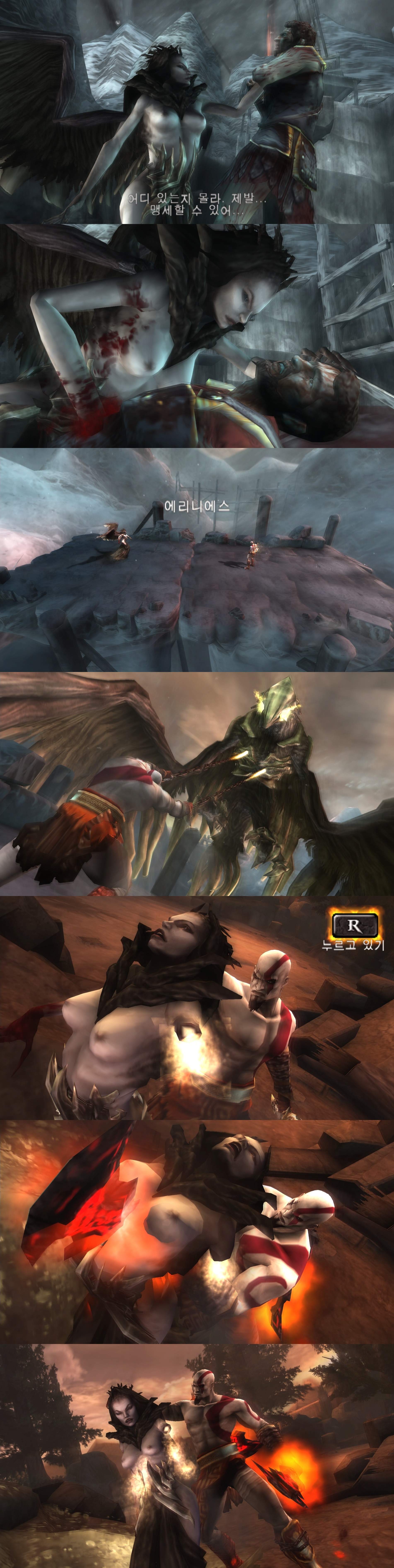 에리니에스는 미친 전쟁의 신이 자신의 아버지를 찾고 있다는 소식을 듣고, 먼저 그를 죽이기위해 스파르타 병사들을 습격하고 있었다. 이에 크레토스는 그녀의 양팔을 찢어버리고, 혼돈의 블레이드로 배빵 놔서 살해ㅋㅋㅋㅋ