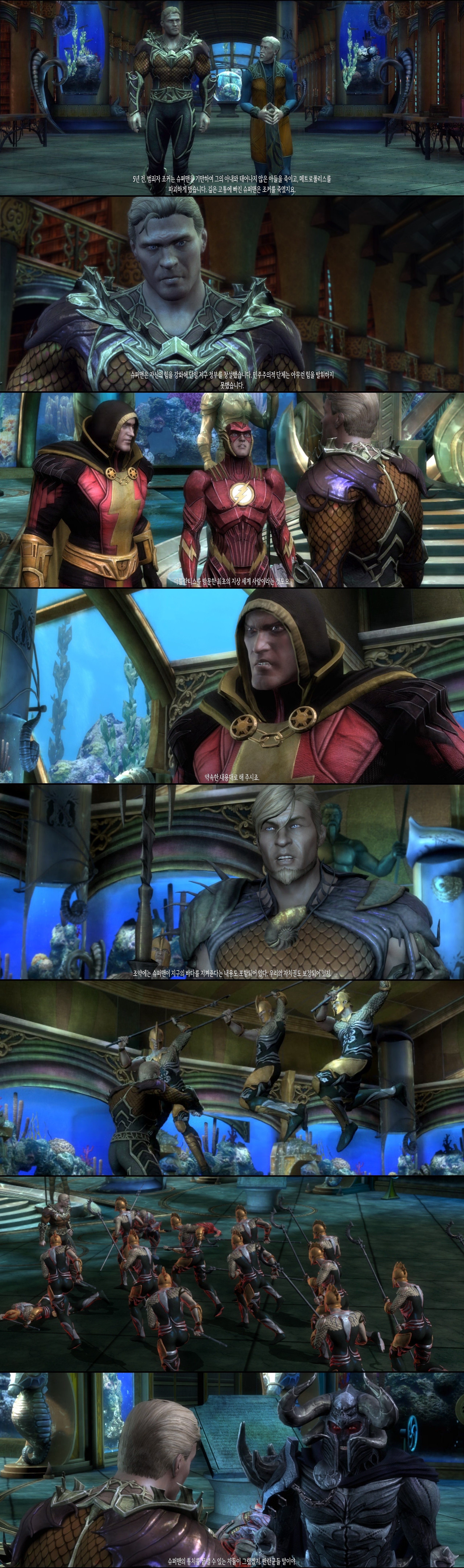 아쿠아맨(프라임): 아틀란티스 팔아넘기려는 레짐 아쿠아맨과 전투. 해양생물들을 데리고 레짐 군대와 전투.