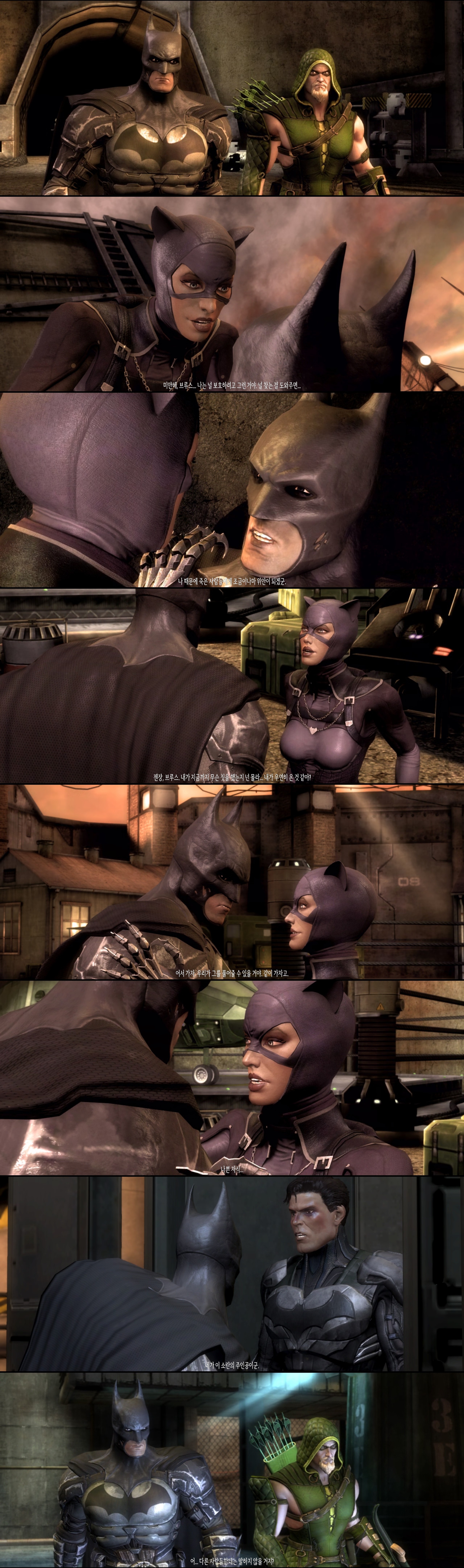 캣우먼은 자신이 레짐에 들어간건 널 보호하기 위해 시간 끌려고 했던 것이었다. 그리고 슈퍼맨한테 함께 사면받고 조용한 곳에 가서 함께 살자고 말한다. 이에 배트맨은 그동안 죽은 사람들을 위해서도 그럴 수 없다고 단칼에 거절.