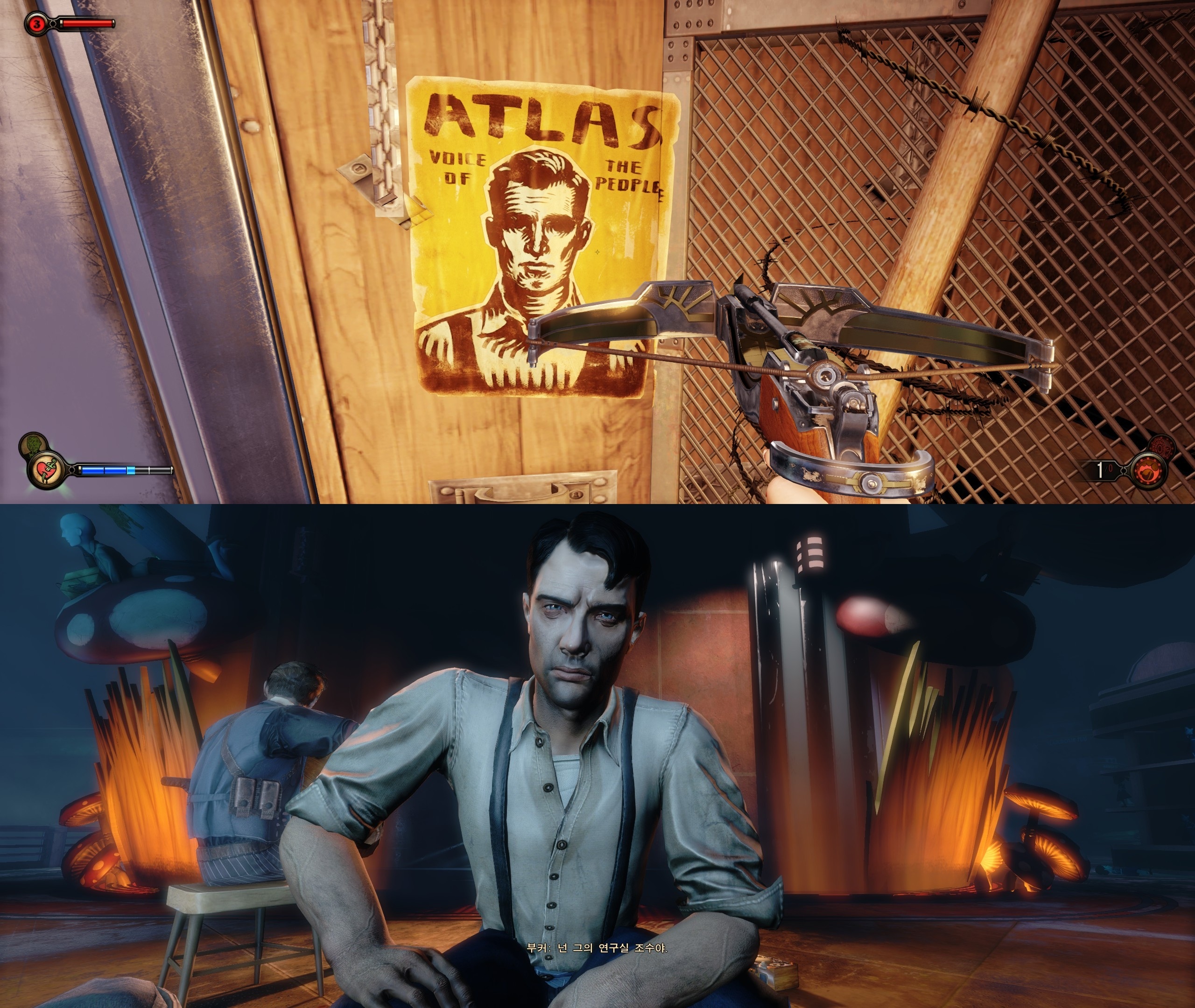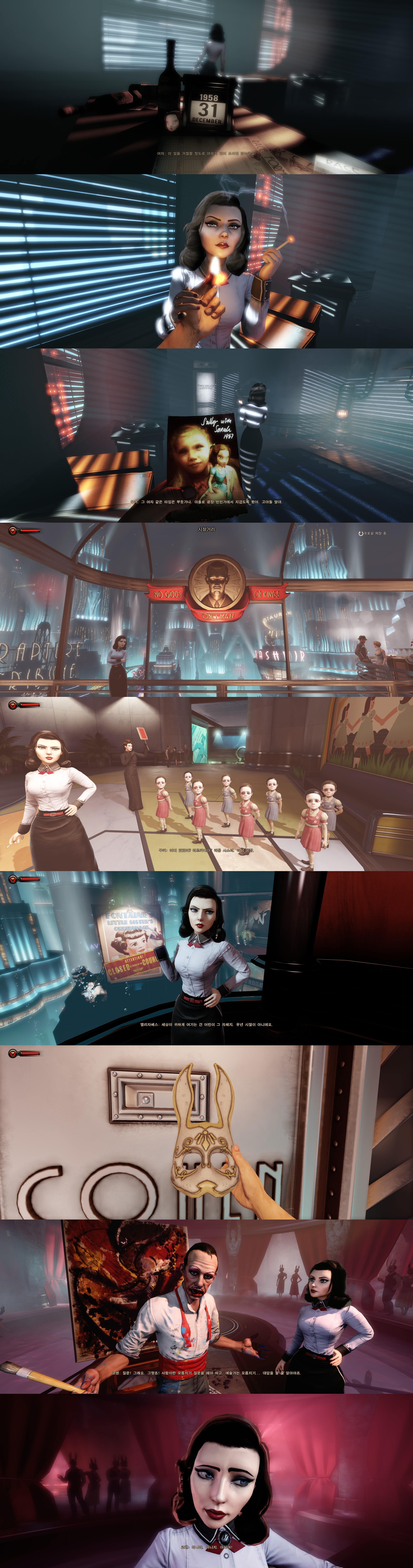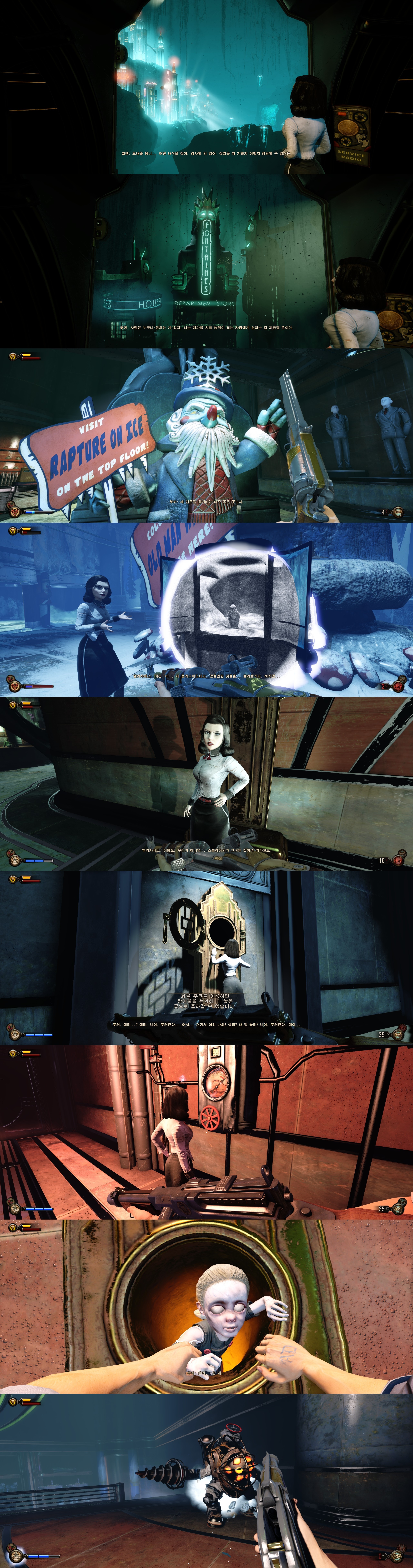 바이오쇼크1에서는 중요 스토리 빼고는 전부 오디오 로그로 다 때웠지만, 인피니트까지 오니까 중요한 설정 같은건 이벤트, 눈에 보이는 물건들로 전부 구현해놨다. 장족의 발전.