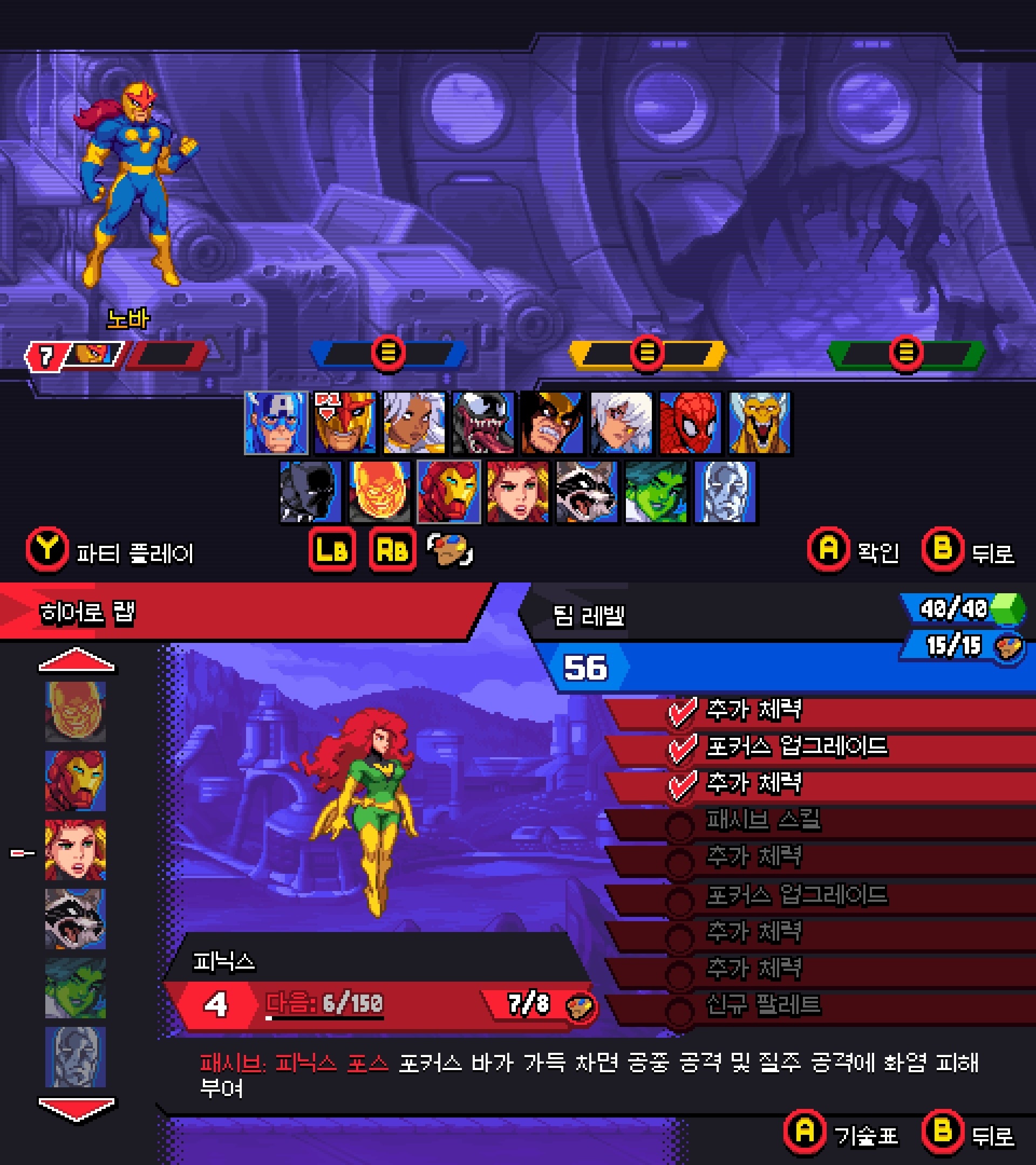 피닉스 눈나 이쁘고 쥰내 쎈 캐릭터인데 게임 스토리에서 활약상 전혀 없음ㅋㅋㅋ 혼자 달에 정찰 갔다가 기생충에 세뇌당하고 다크 피닉스가 됐다가 울버린한테 처맞고 제정신을 차린다. 엔딩에서 울버린과 즐겁게 농구.
